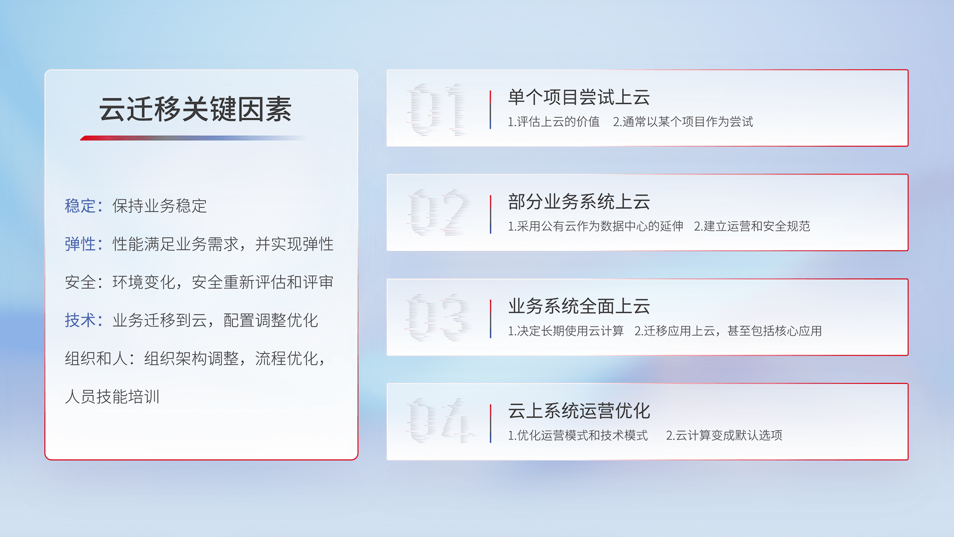 结合实际业务,,,从规划设计、、云平台选型、、、、云原生改造、、、数据迁移、、集成交付,,,,迁移全过程为客户识别最佳上云路径,,做好风险识别管理,,,设计网络架构、、、、身份权限、、安全审计合规、、、、操作审计、、日志审计、、监控告警策略、、、多站点容灾设计等,,,对云上基础设施进行整体规划,,提升IT治理水平,,以满足弹性、、、、高可用、、高性能的需求。。