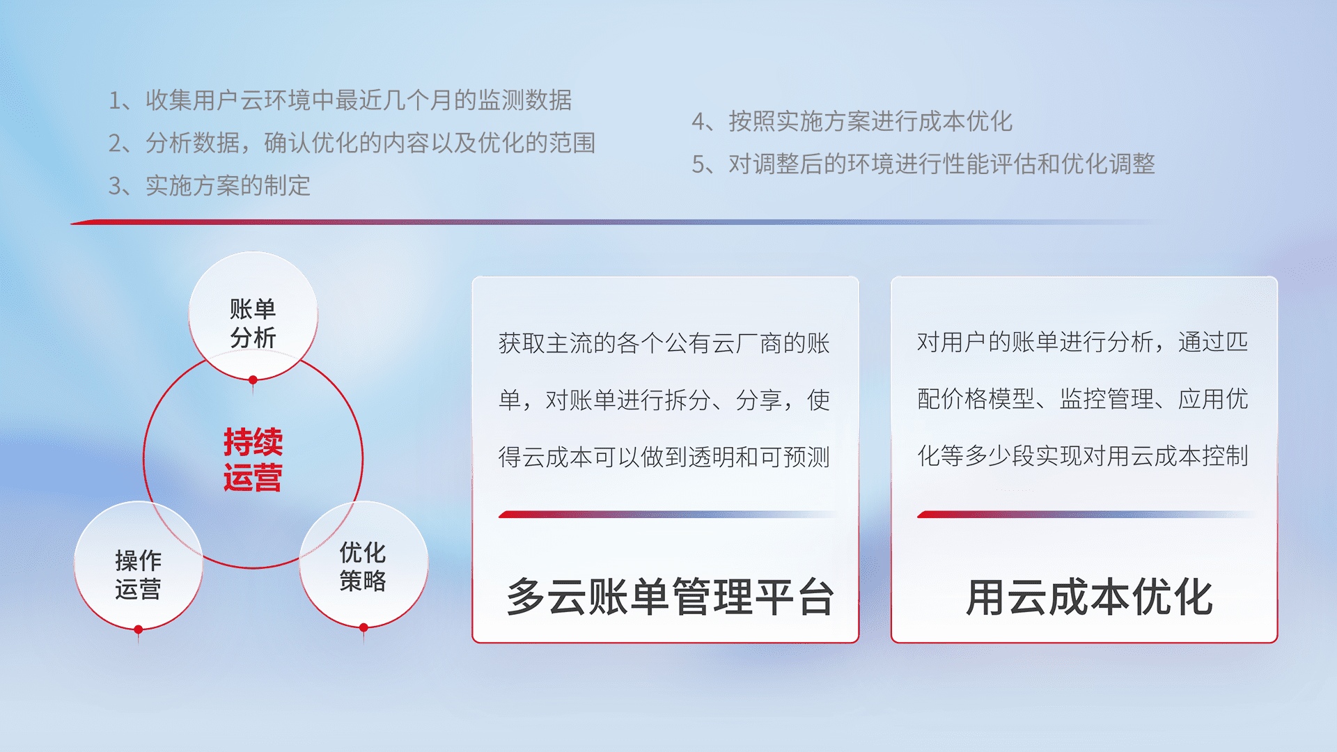通过多云纳管,,,,以统一的资源数据模型把客户的云资源进行抽象和封装,,,,进而实现对多云资源的统一操作,,保障云资源管理的可靠性、、、稳定性与可用性。。。量身定制化运维内容,,配置、、、、开发运维、、、补丁管理、、、备份、、监控、、认证和访问管理、、、、审计和日常巡检等,,,保障在用云过程中的可靠度,,,稳定度以及高可用率。。。。